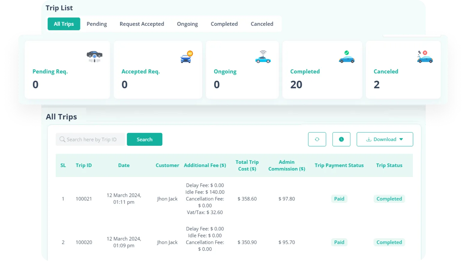 Track real-time trip activities & detailed fares effortlessly with the trip management section from ride sharing app admin panel.